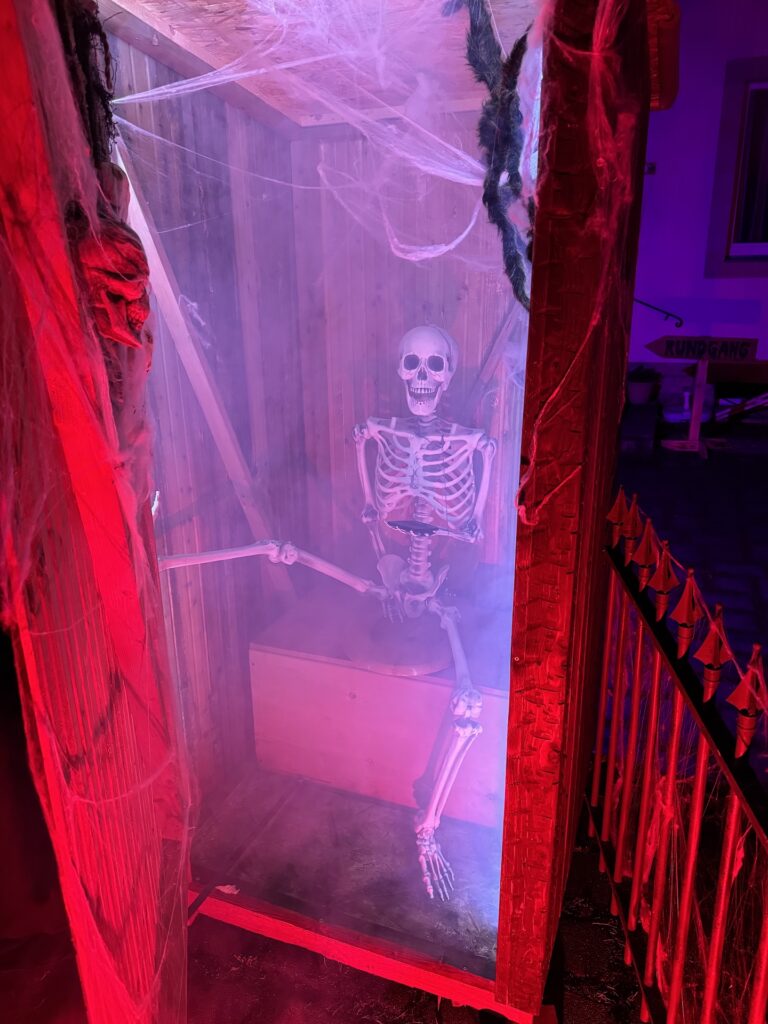 Begleitet wurde der Gang auf dem Hof von leuchtenden Schatten, die über die Wände huschten, während unheimliche Stimmen aus Lautsprechern flüsterten. Ein Highlight waren einmal mehr die singenden Kürbisse, die mit ihrem flackernden Licht und lustigen Liedern für eine humorvolle Abwechslung zwischen all den Schreckmomenten sorgten.v
